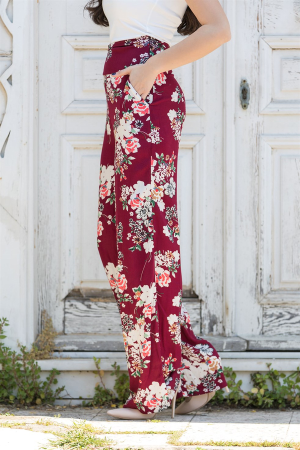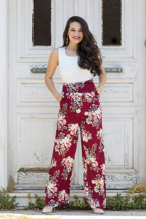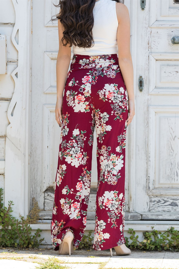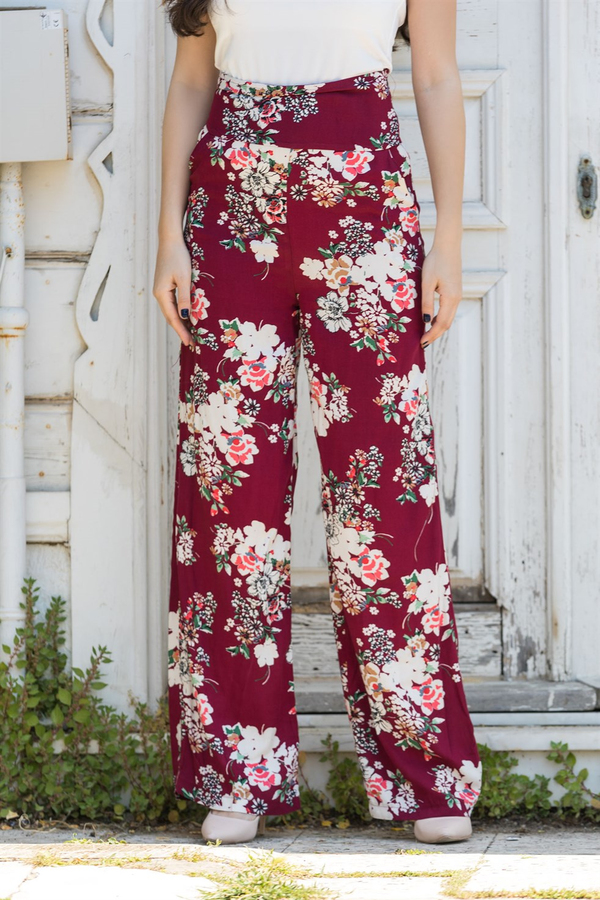 Yüksek Bel Çiçekli Pantolon - BORDO