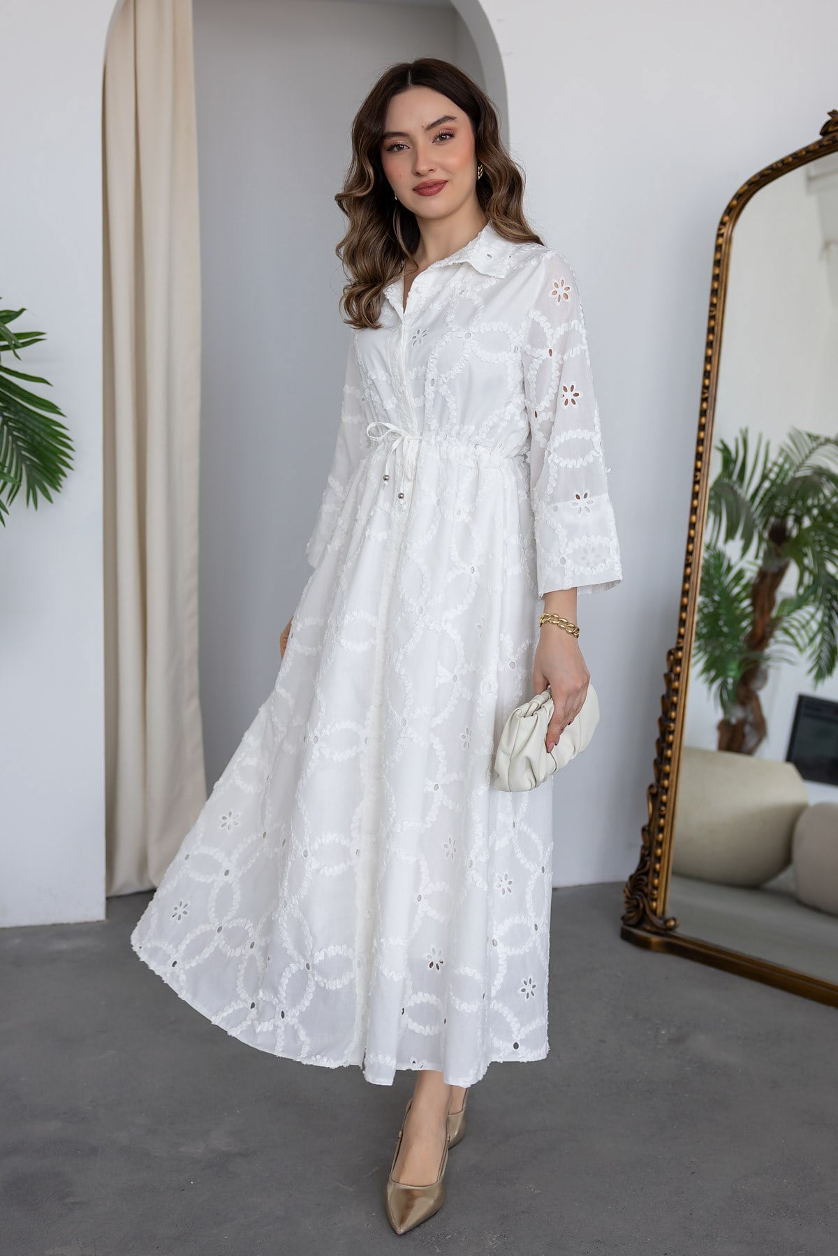 Bağcıklı Brode Elbise - BEYAZ (BFW383ELB0011101)