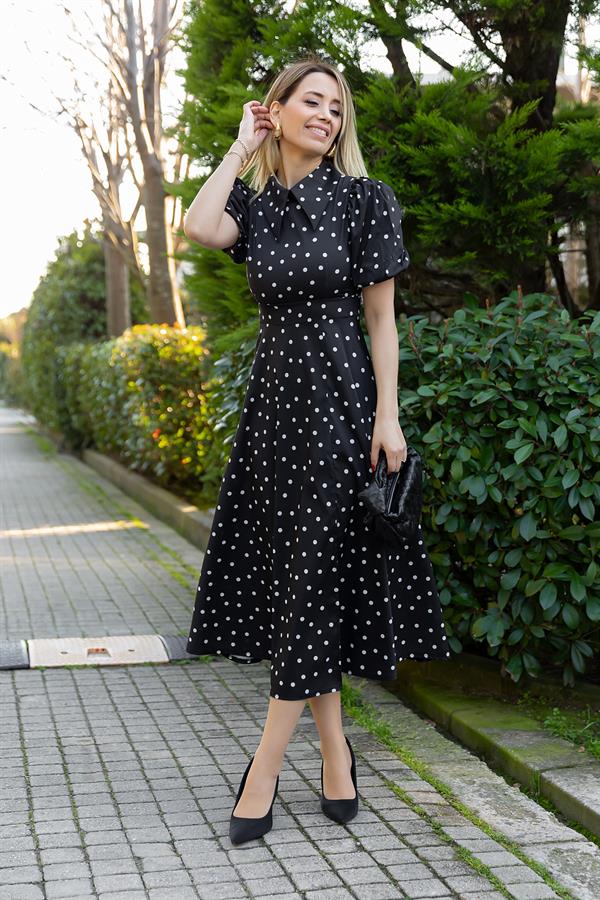 Ürün 36-42 bedene kadar uyumlu, yakalı, balon kol, arka fermuar kapamalı, kuşaklı, yırtmaçlı, puantiyeli, midi elbise olarak tasarlanmıştır.