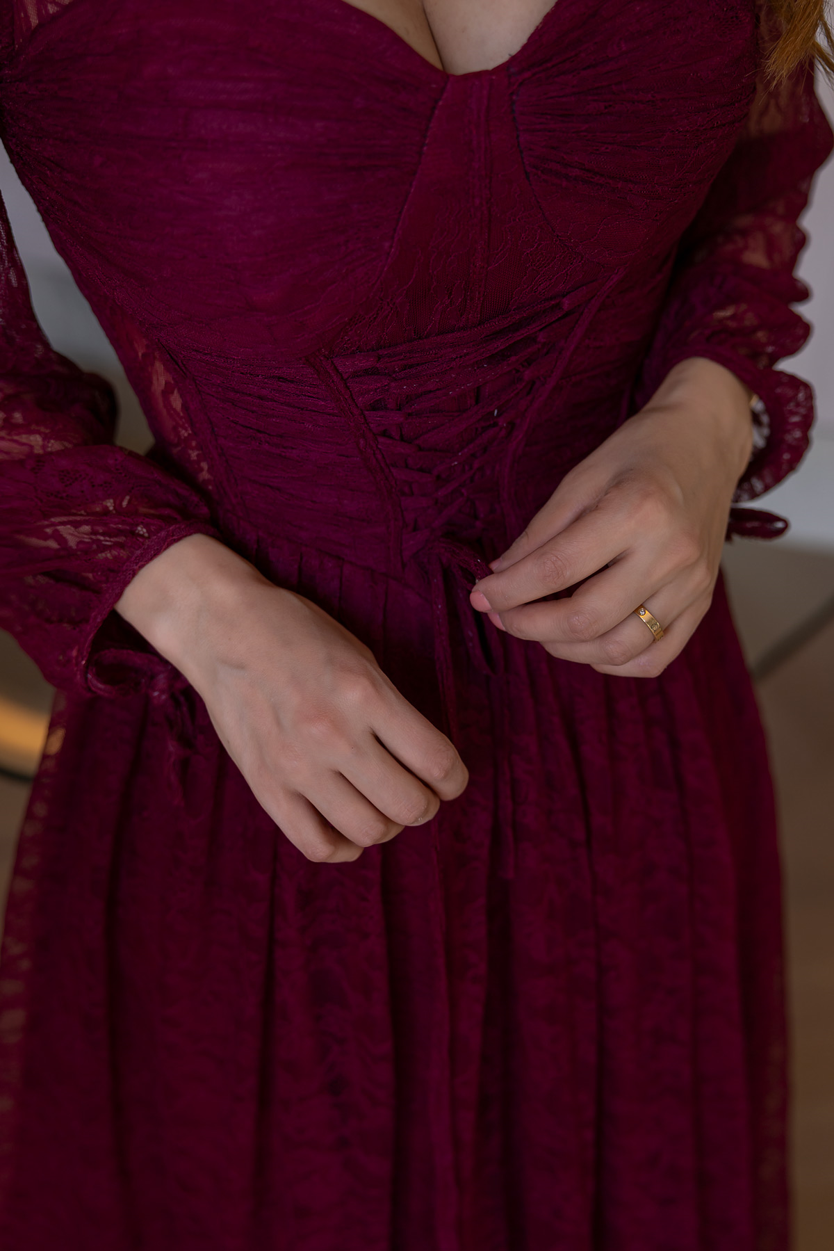 Bel Bağcıklı Dantel Abiye - BORDO (BFW616ABY0003121)