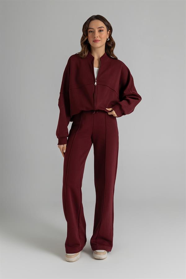 Ürün 36-38 bedene kadar uyumlu, fermuarlı sweatshirt, bağcıklı, dikiş detaylı eşofman altı takımı olarak tasarlanmıştır.