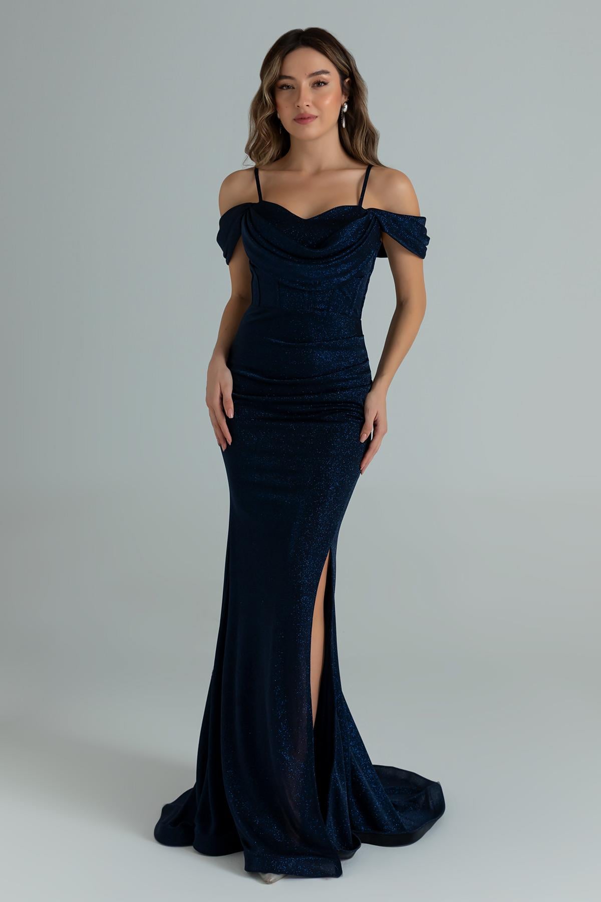 Bel Drapeli Simli Abiye - LACİVERT (BES008ABY0001110)