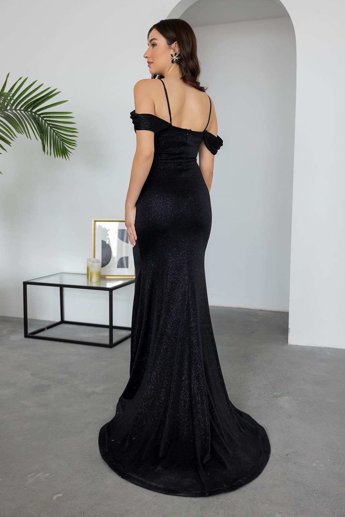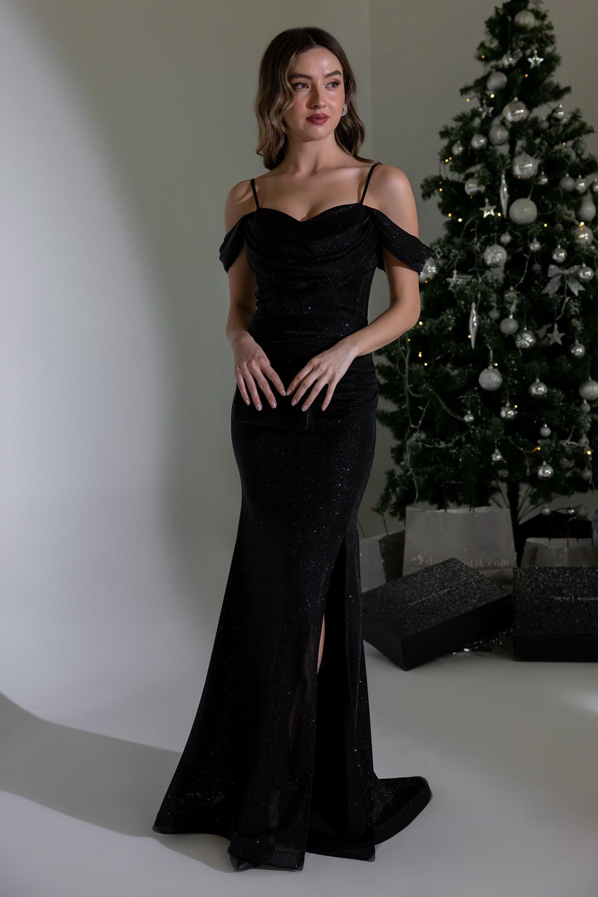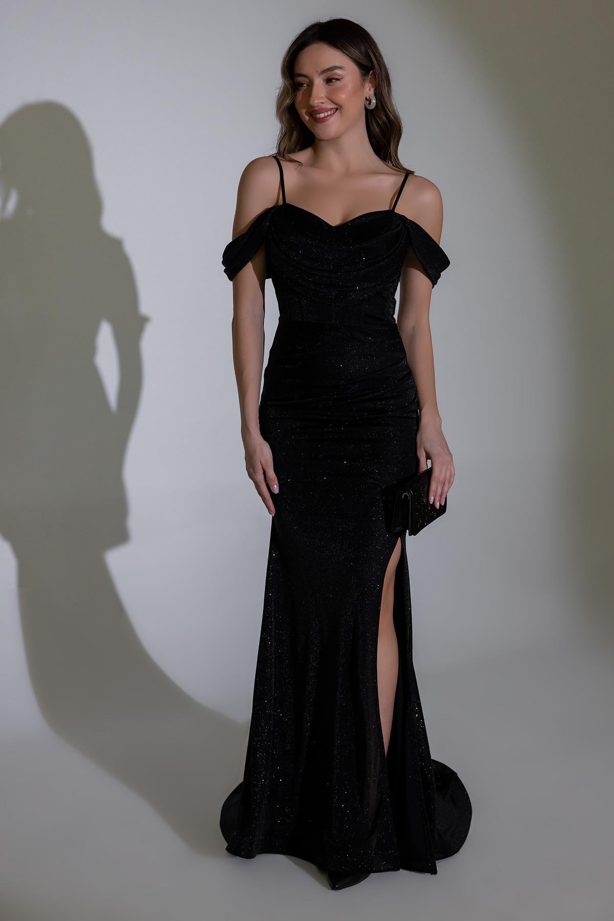 Bel Drapeli Simli Abiye - SİYAH (BES008ABY0001100)