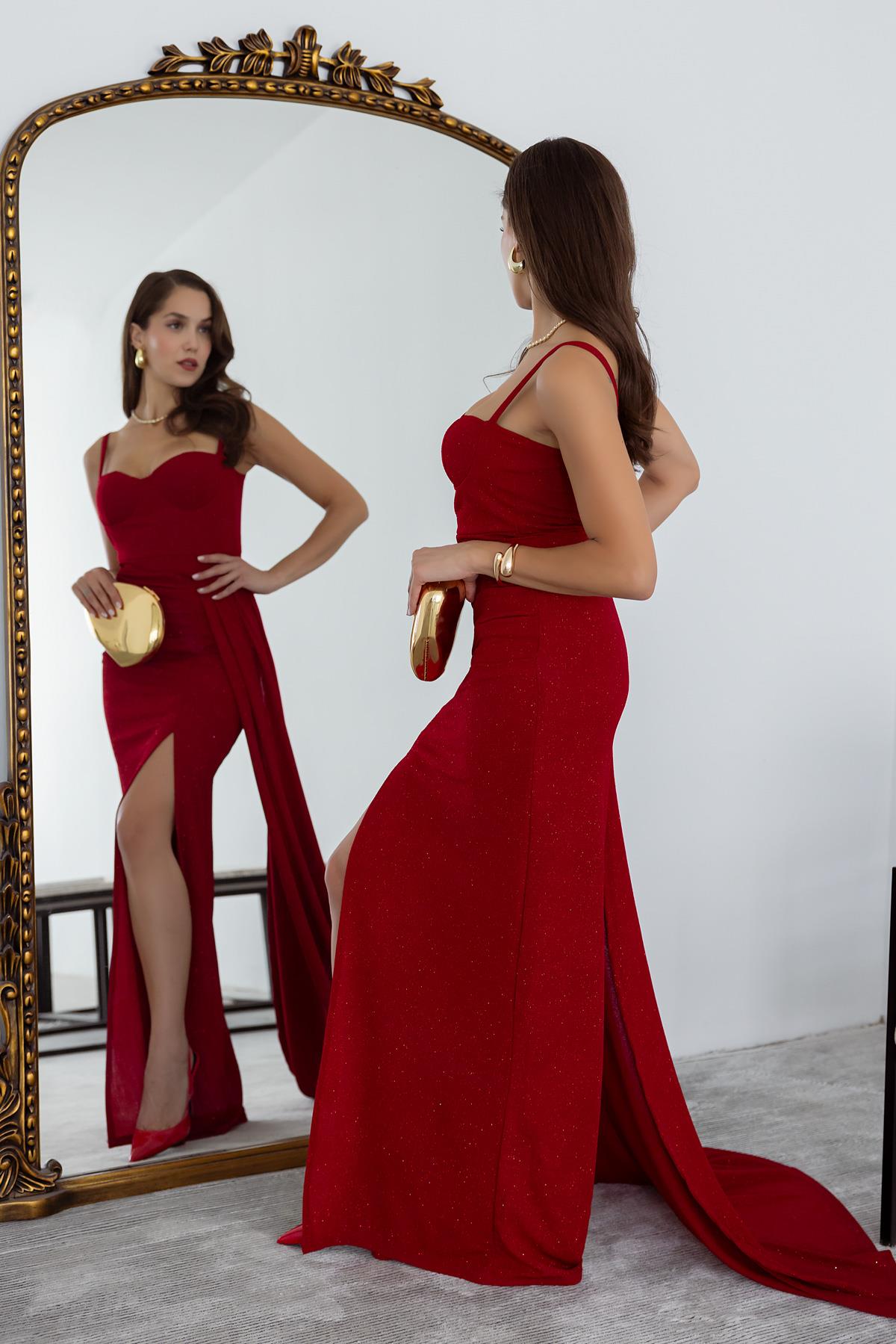 Drapeli Simli Abiye - KIRMIZI (BES080ABY0001124)