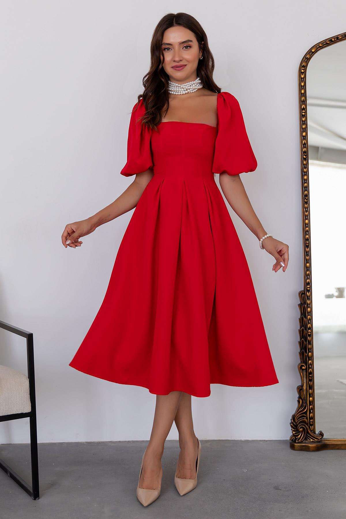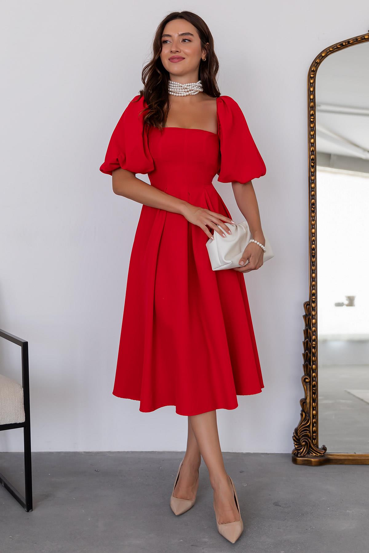 Balon Kol Midi Elbise - KIRMIZI (BES093ELB0008124)