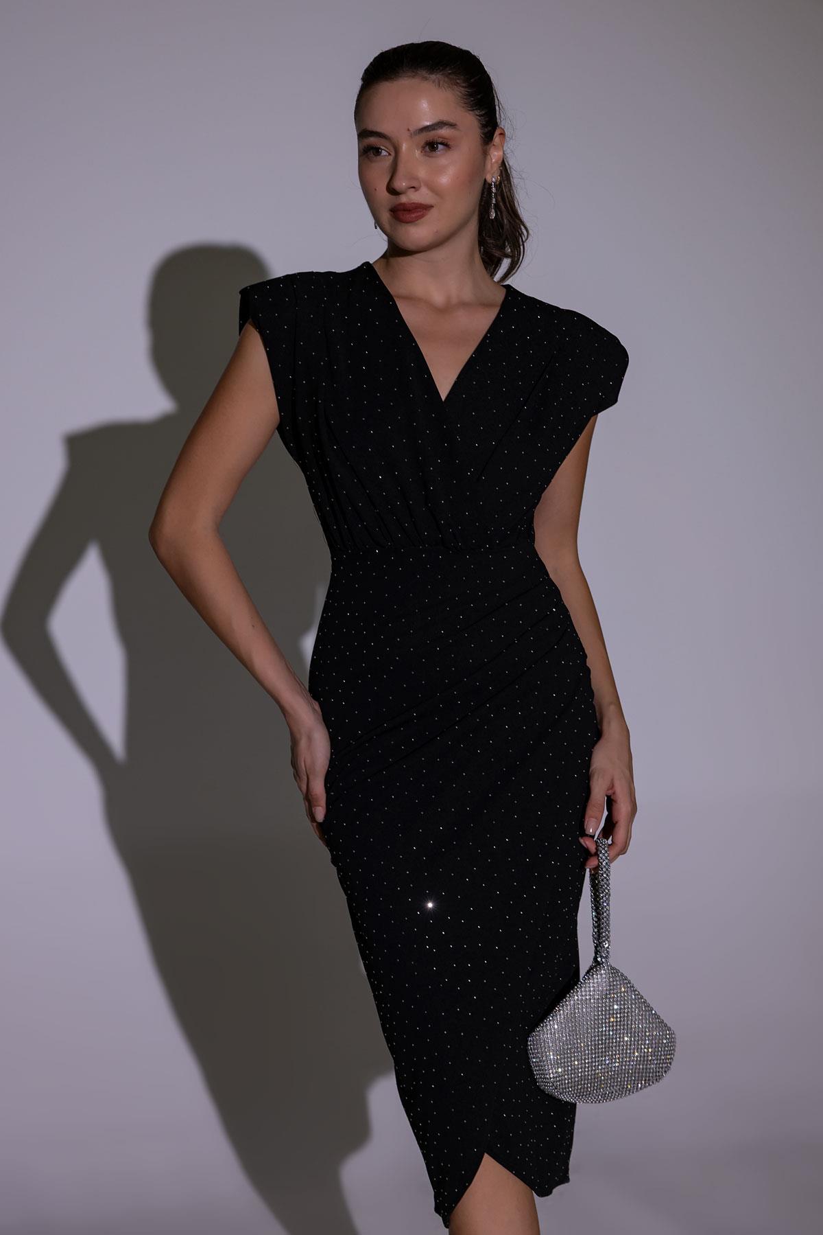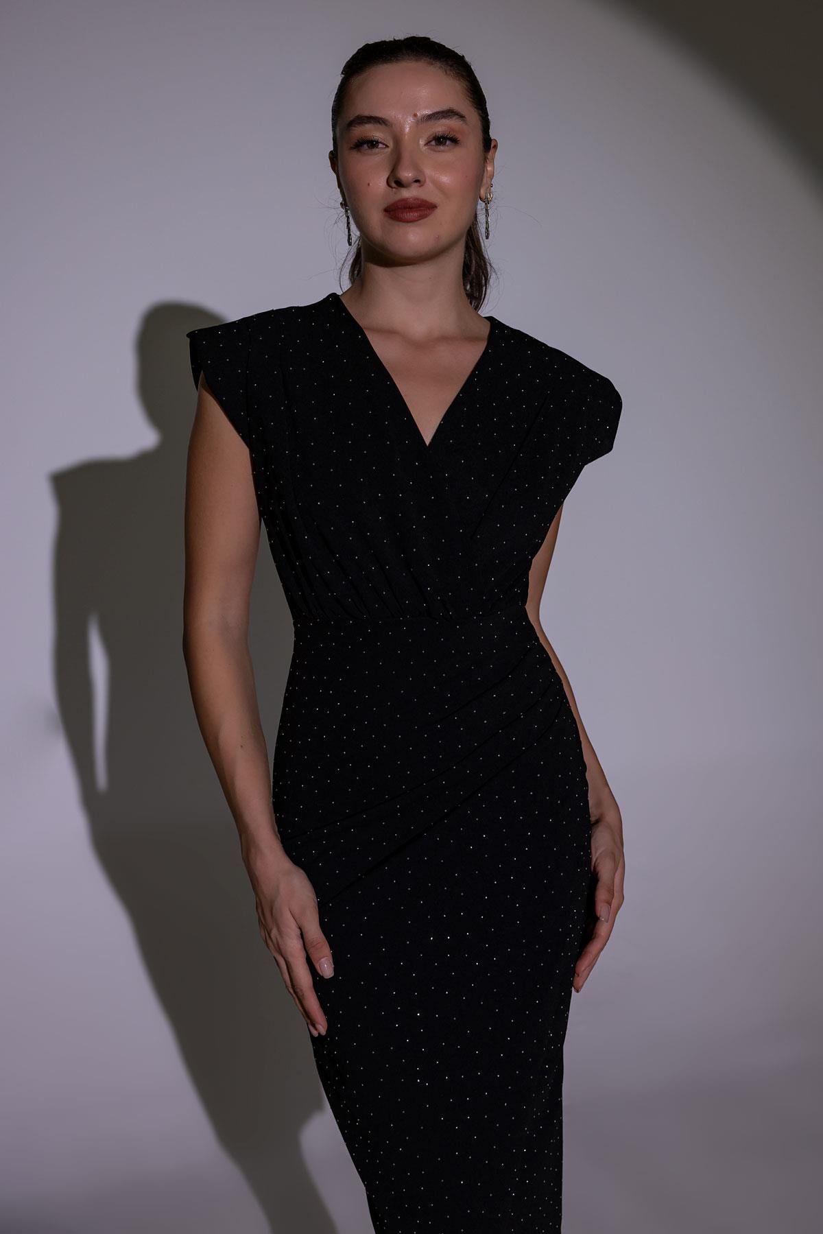 Vatkalı Taş İşlemeli Elbise - SİYAH (BES065ELB0033100)
