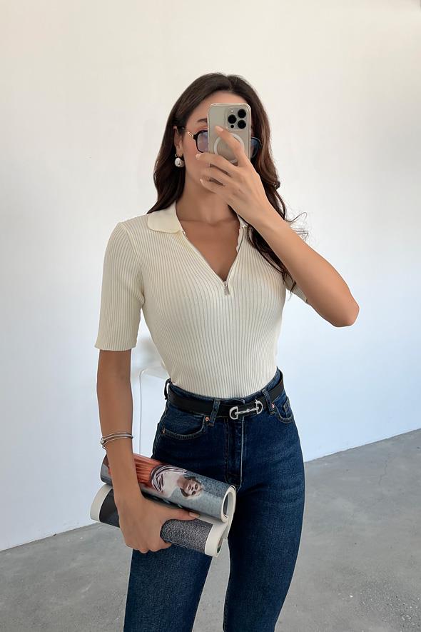 Fermuarlı Triko Bluz - EKRU (BES217BLZ0003123)