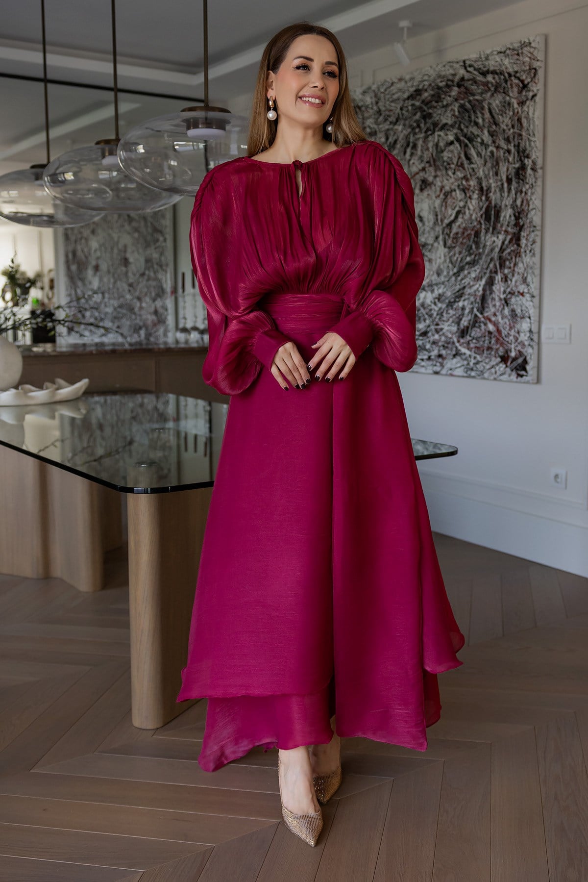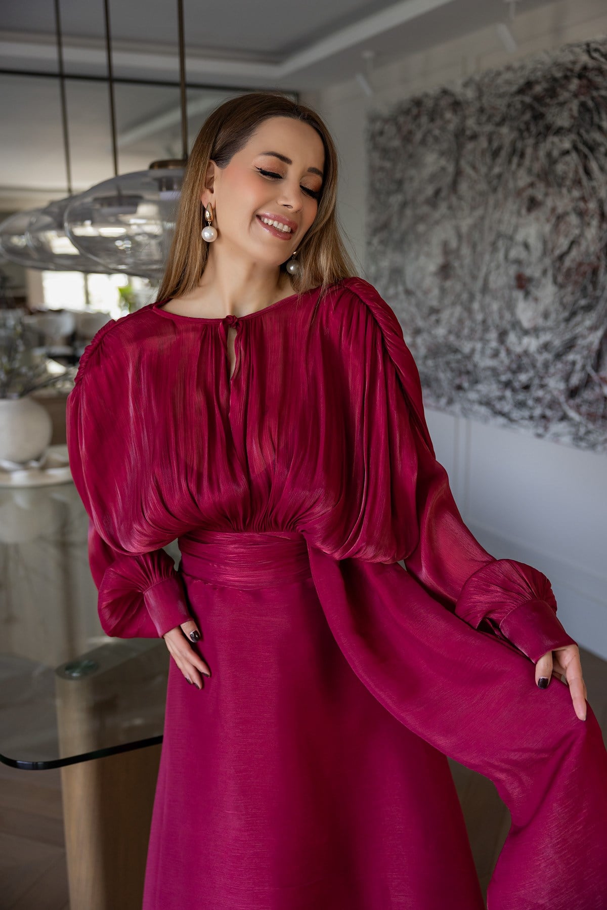 Dökümlü Saten Elbise - KIRMIZI (BFW747ELB0001124)