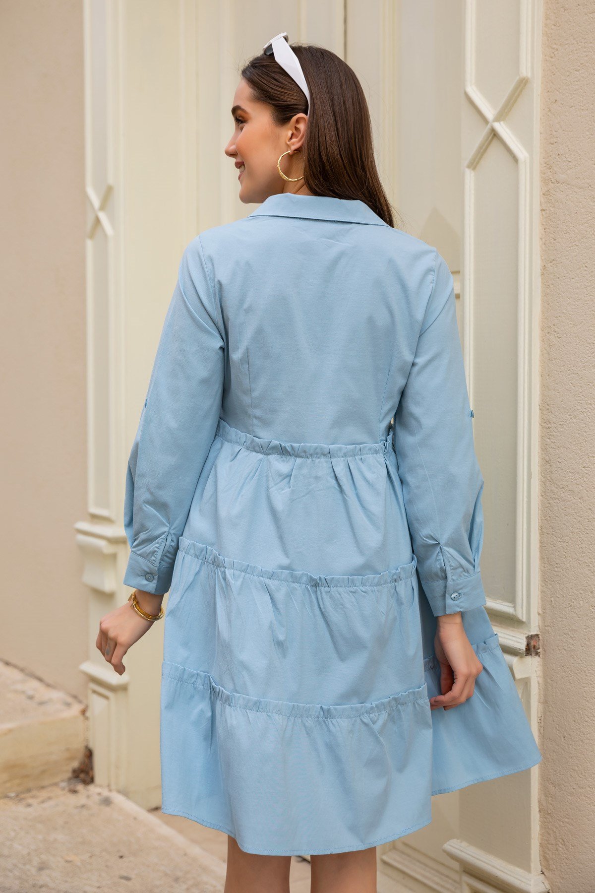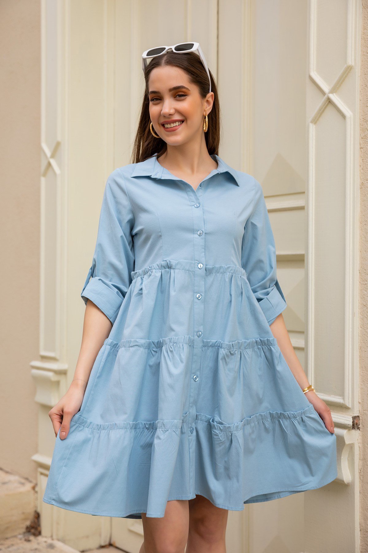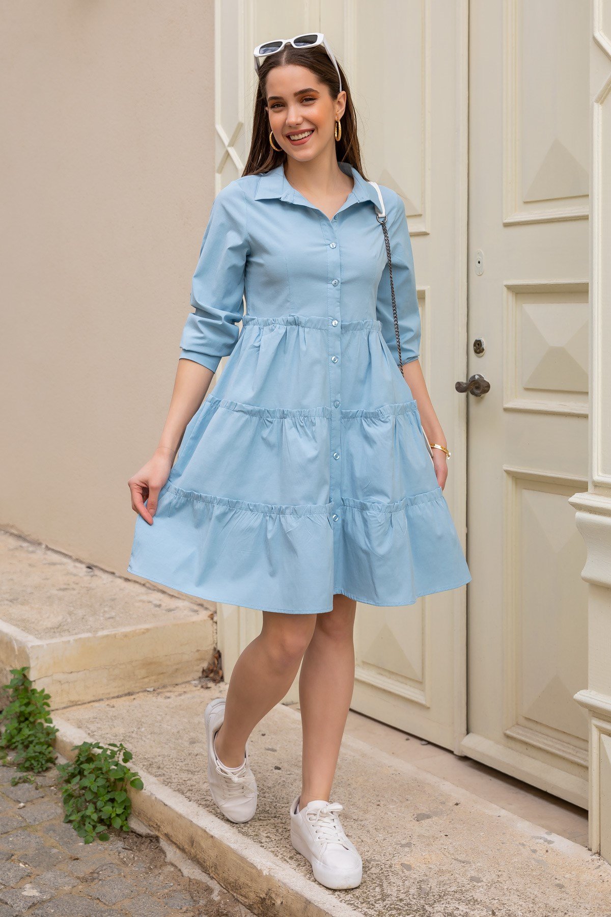 Ürün 36-42 bedene kadar uyumlu, tok kumaş, gömlek yaka, boydan düğmeli, pamuklu, katlı, fırfırlı, poplin elbise olarak tasarlanmıştır.