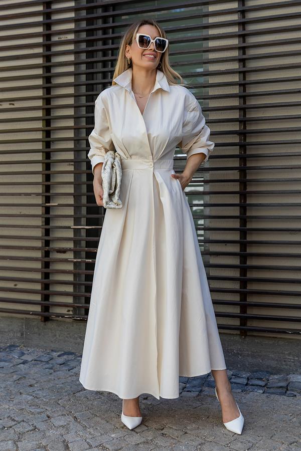 Ürün 36-42 bedene kadar uyumlu, anvelop kapamalı, önden düğmeli, cepli, bel lastik detaylı elbise olarak tasarlanmıştır.