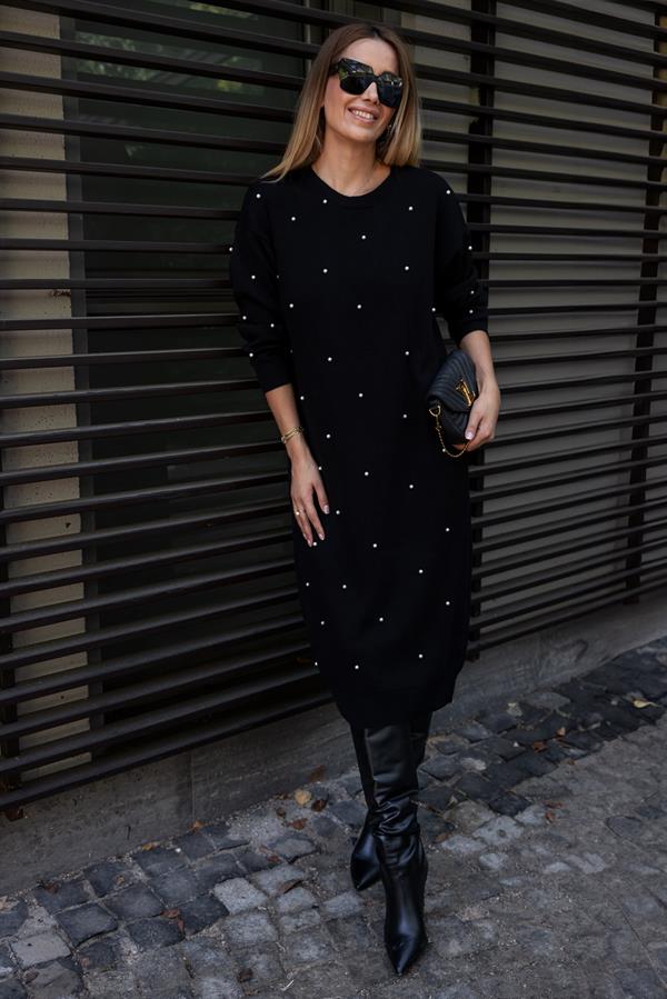 Ürün STD bedene kadar uyumlu, inci işlemeli, yuvarlak yaka, uzun kollu, geniş kalıp, esnek kumaş, triko, elbise olarak tasarlanmıştır.