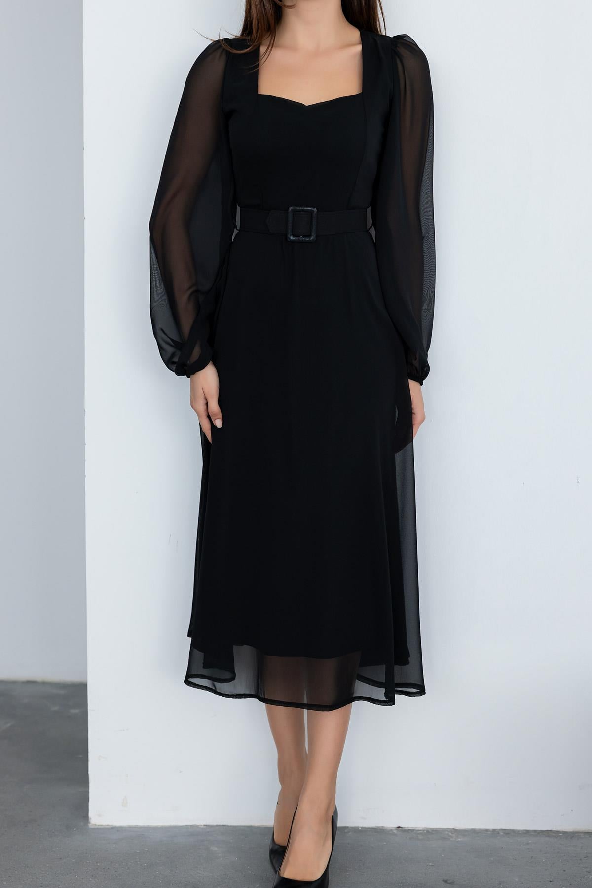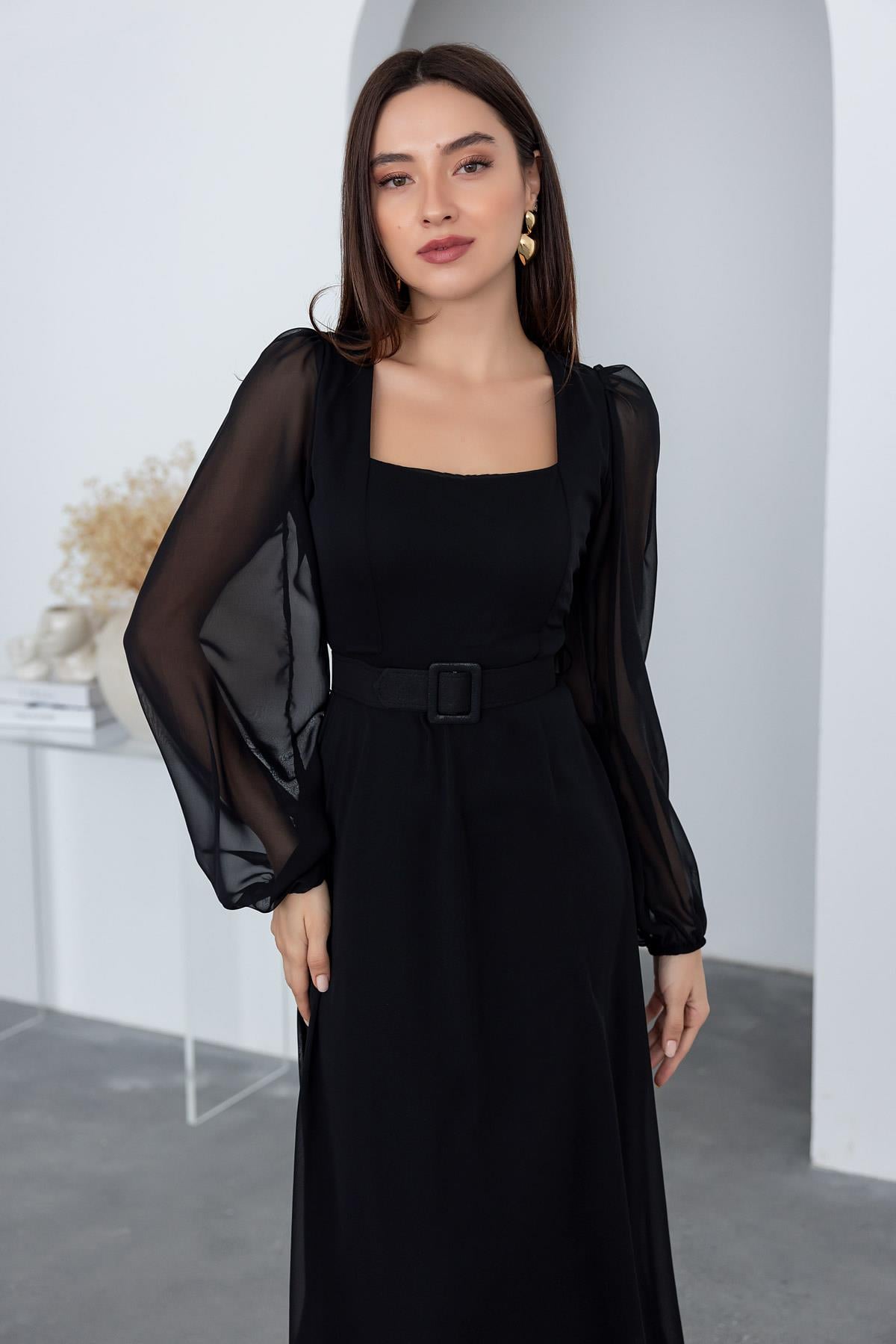 Kare Yaka Şifon Elbise - SİYAH (BEW531ELB0033100)