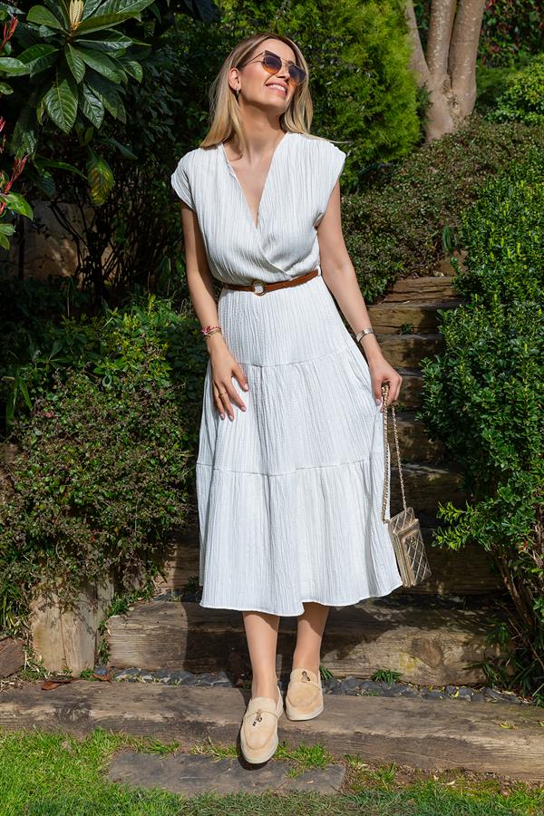 Ürün 36-40 bedene kadar uyumlu, kruvaze yaka, kısa kollu, kemerli, astarlı, müslin kumaş, midi elbise elbise olarak tasarlanmıştır.