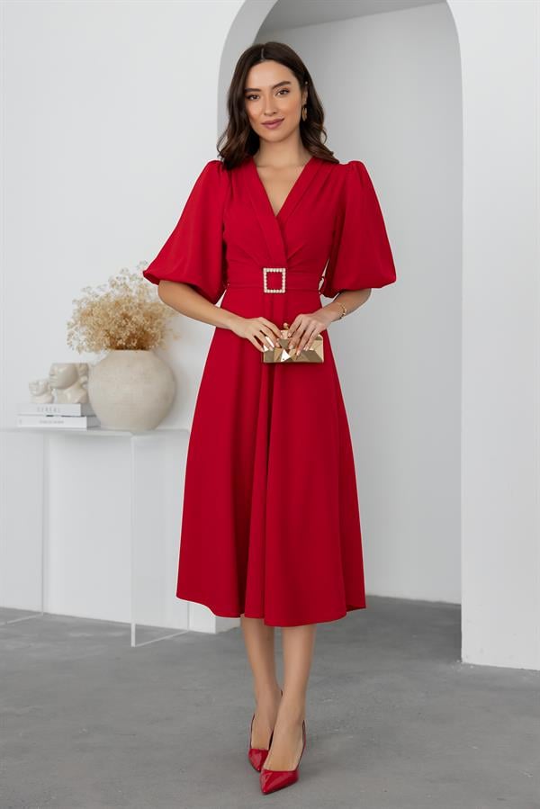 Kruvaze Yakalı Midi Elbise - KIRMIZI