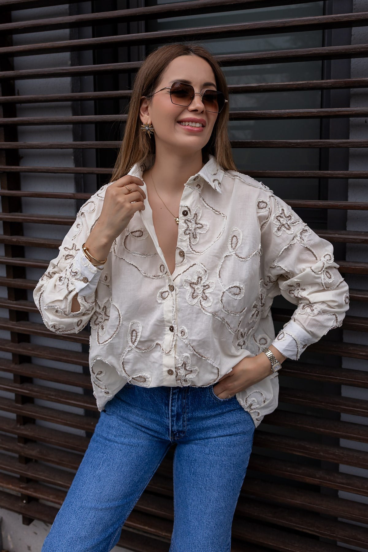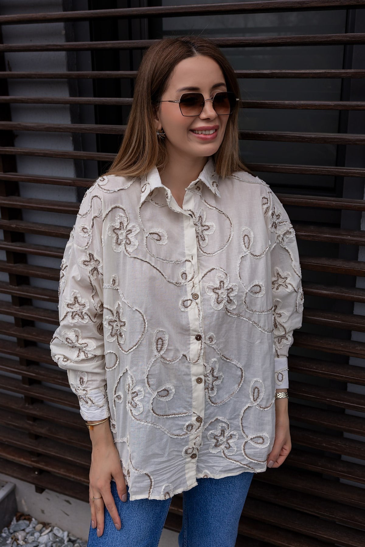 Nakışlı Keten Gömlek - EKRU (BFW278GÖM0001123)