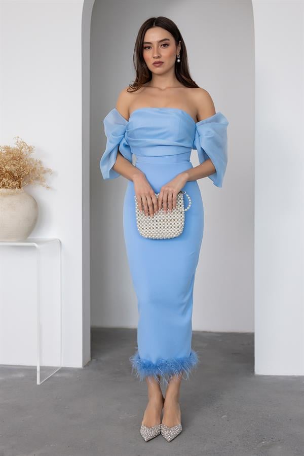 Otriş Detaylı Midi Abiye - BEBE MAVİSİ