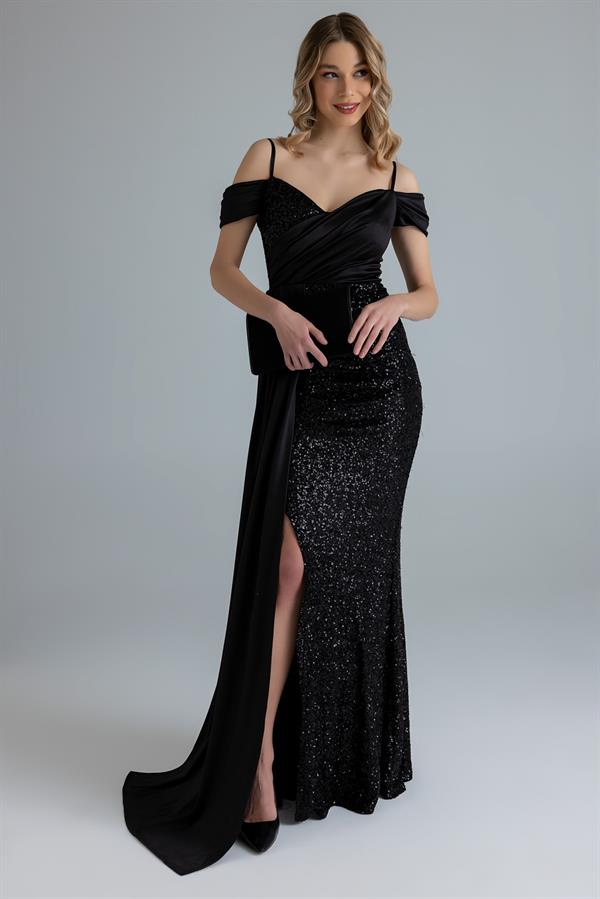 Payetli Pelerin Detay Abiye - SİYAH