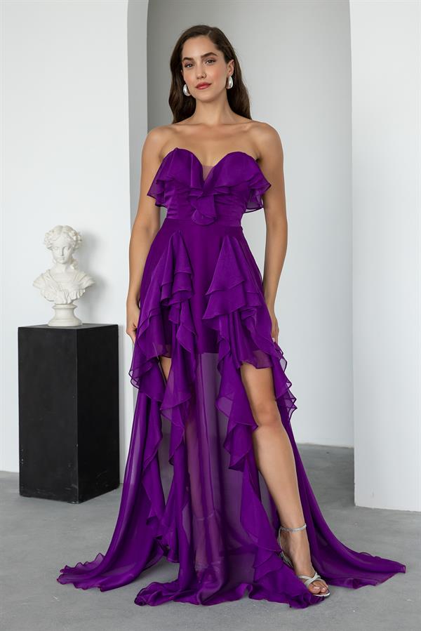 Ürün 36-40 bedene kadar uyumlu, göğüs pedli, göğüs ve önü fırfır detaylı, sırt fermuar kapamalı, astarlı, yırtmaçlı, abiye olarak tasarlanmıştır.