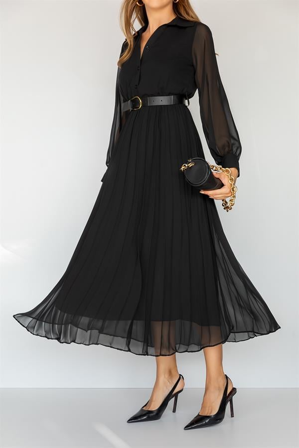 Şifon Piliseli Elbise - SİYAH