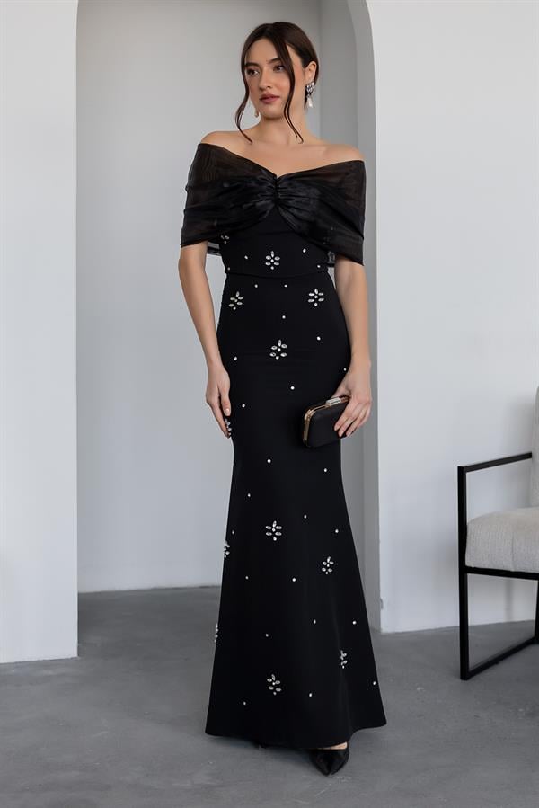 Straplez Taş İşlemeli Abiye - SİYAH