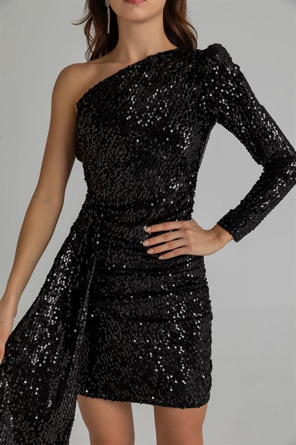 Ürün 36-42 bedene kadar uyumlu, tek omuz, yan fermuar kapamalı, omuz vatkalı, büzgülü, yan kuşak detaylı, astarlı, payetli, mini elbise olarak tasarlanmıştır.
