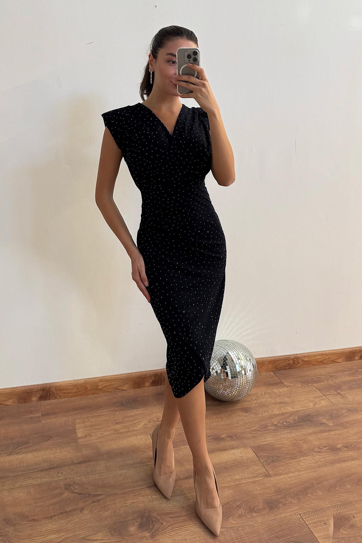 Vatkalı Taş İşlemeli Elbise - LACİVERT
