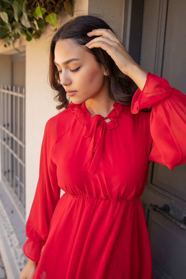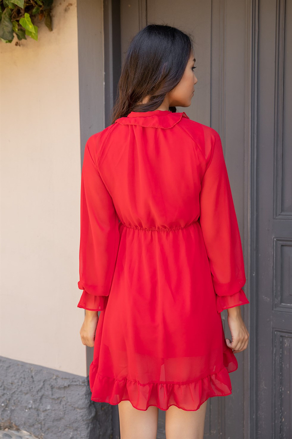 Yaka Fırfır Astarlı Elbise - KIRMIZI
